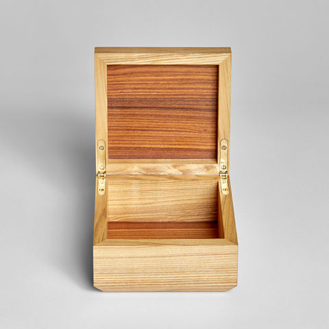 A simple piece, designed to show off the beauty of the timbers. With a leather base and a deep chamfer to the sides, the box floats on very small shadow gap. The top is recessed to frame the contrasting timber and provide some subtle tactile interest.